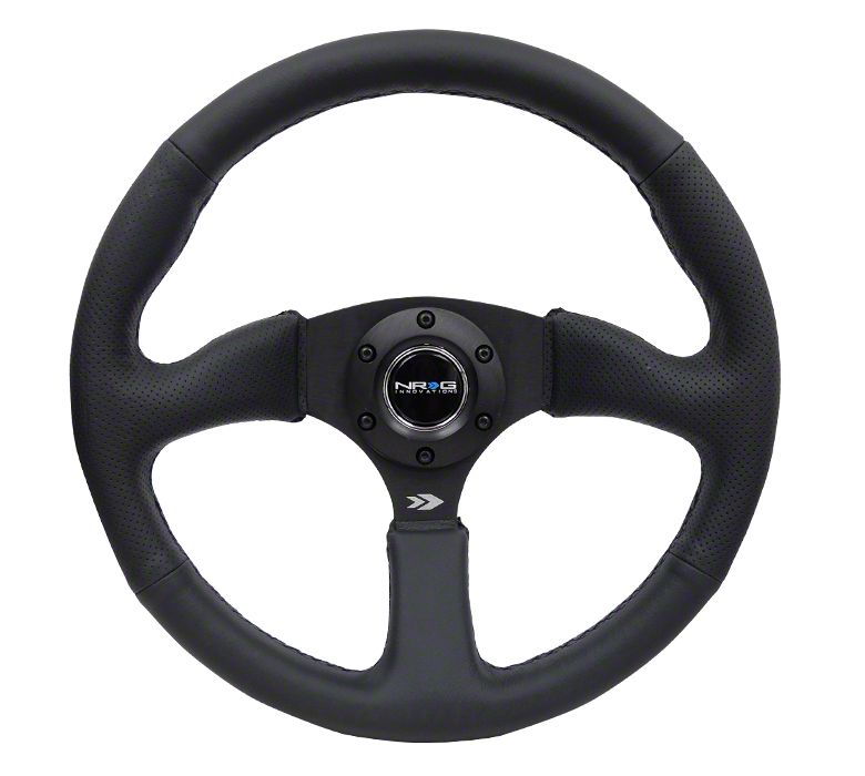Construction and Appearance. Crafted from high-quality materials, the NRG Innovations Sport Steering Wheel features a lightweight yet reinforced construction for durability. The black leather-wrapped rim ensures a comfortable grip, while the double-riveted spokes add extra strength and rigidity. The sleek and stylish design enhances the overall look of your vehicle’s interior.