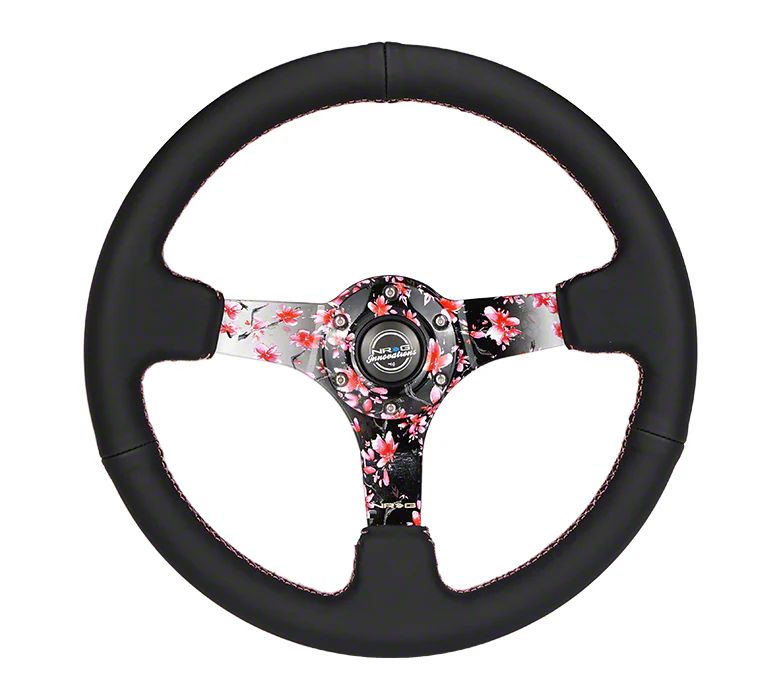 Construction and Appearance. Crafted from high-quality black leather, this steering wheel is engineered for durability, comfort, and style. The hydro dipped Sakura floral spokes introduce a vibrant touch of Japanese-inspired design, offering an elegant contrast to the dark leather. The 3-inch deep dish profile contributes to better control and responsiveness, while the entire build is both rugged and refined.