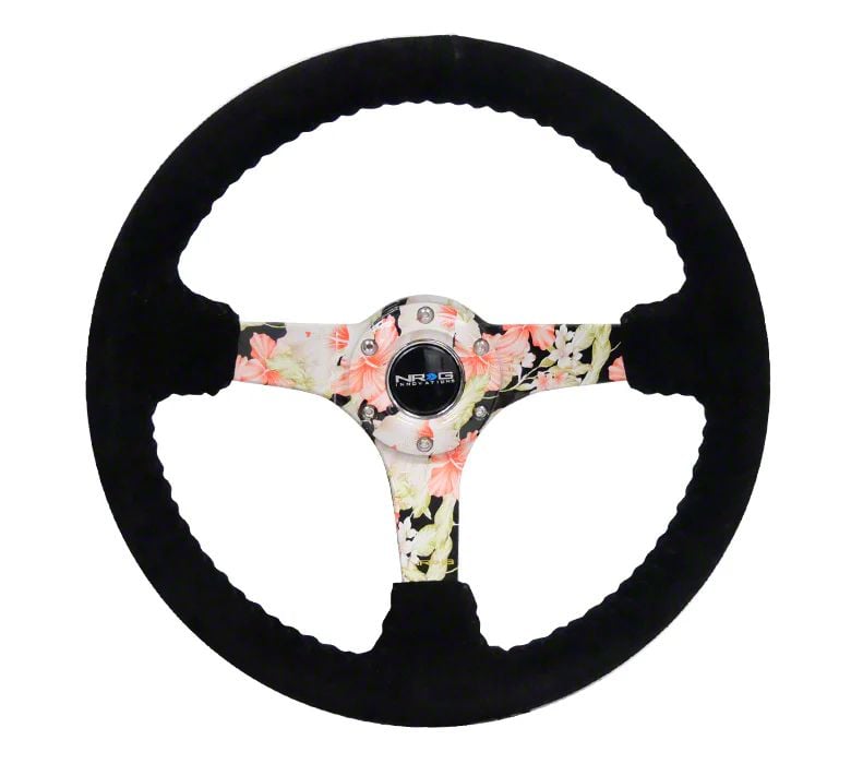 NRG Innovations 350mm 3-Inch Deep Dish Steering Wheel; Black Suede with Black Stitching and Hydro-Dripped Floral Spokes