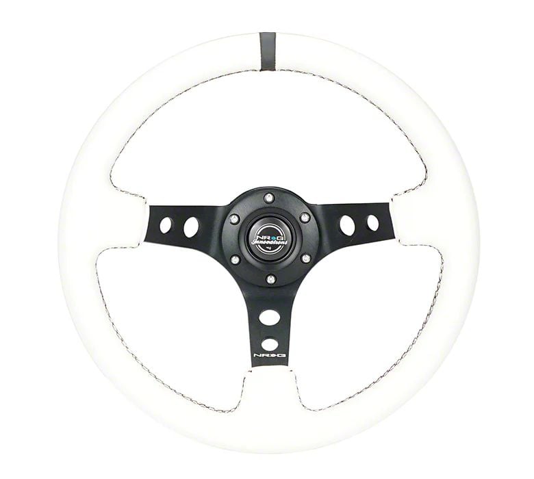 NRG Innovations 350mm 3-Inch Deep Dish Steering Wheel. The NRG Innovations 350mm 3-Inch Deep Dish Steering Wheel is a high-quality performance upgrade designed to enhance the driving experience. This steering wheel features a sleek, stylish design with white leather and black spokes, offering superior grip and a sporty aesthetic. It is perfect for automotive enthusiasts looking to improve both the look and feel of their vehicle’s interior.