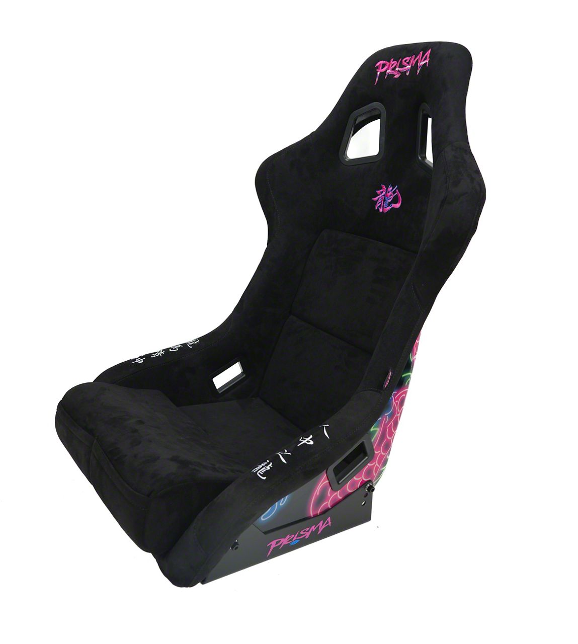 Construction and Appearance. Built with a fiberglass reinforced shell, this seat is wrapped in premium black Alcantara material for a luxurious, high-end feel. The embroidered dragon logo adds a distinctive, aggressive look, making it stand out in any performance interior.