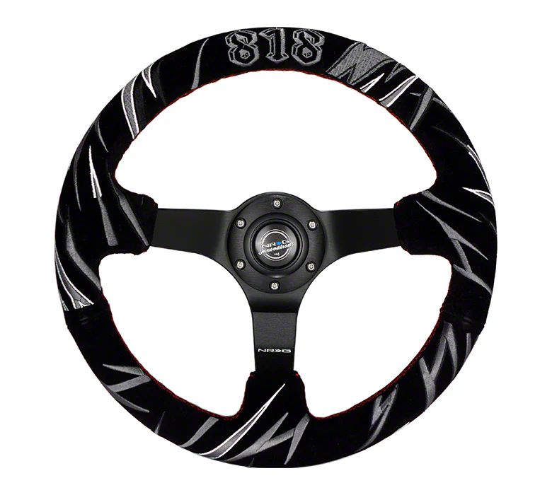 Construction and Appearance. Crafted with a premium black suede finish, this steering wheel features an 818 Jeff Jones Racing pattern that's beautifully embroidered for a sleek, race-ready look. The wheel includes extra-padded inserts, offering both improved comfort and enhanced grip during aggressive driving conditions. The construction is focused on durability and control, making it a high-performance interior component.