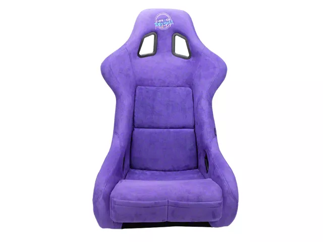 Experience Race-Ready Support With Stunning Visual Appeal. The NRG Innovations Prisma Large Bucket Seat covered in Purple Vegan Alcantara combines aggressive racing ergonomics with luxurious, eco-conscious materials. Perfect for drivers who want superior side support without sacrificing visual impact, this seat enhances control during aggressive driving while elevating interior style.