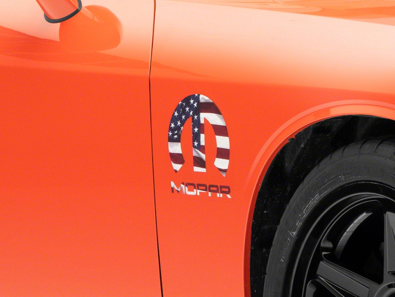 Mopar, Stars and Stripes. Now you can add patriotic Mopar styling to your Dodge Challenger with this officially licensed Mopar M Logo that features an American Flag Design. This Mopar Decal measures 8.17 x 7.20 inches and can be applied to any smooth flat surface and looks especially good across your hood, on your lower fender, or in the back window.