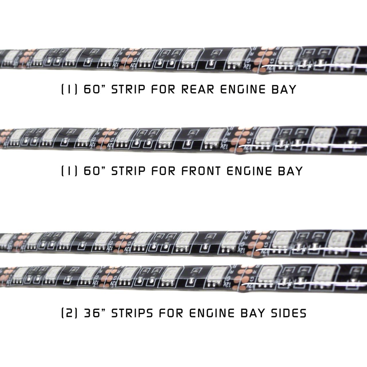 Add Style and Lighting to Your Engine Bay. Light up your engine bay with this specially designed ultra-bright kit from ORACLE Lighting. The kit includes LED strips that feature high-quality USA-made Bridgelux SMD chips, which have an excellent lumen-to-watt efficiency rating. Not only are the SMDs ensure maximum quality, extraordinary brightness, and superior longevity, but also come with more LEDs per section in comparison to their counterparts. In addition, the LED strips are sealed with top-grade silicone to be extremely flexible in order to not yellow or fade due to engine bay heat.