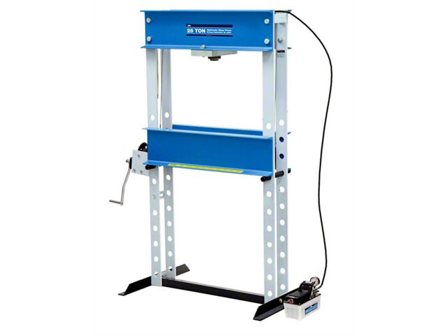 OTC's tough, economical, 25-ton capacity press features heavy steel construction with a durable powder coat finish, and is ideal for pressing rear axle bearings, piston pins, and much more. Large 30 inch x 46 inch work area under ram makes positioning of even bulky work easy. Pneumatically driven hydraulic pump with simple foot operation keeps both hands free; press bed is raised or lowered with a hand crank, allowing one-person set-up and operation. Press comes complete with No. 4020 Air-Driven Hydraulic Pump, No. 9652 Gauge, No. 24815 Tee, No. 9768 Hose, No. 51426 Hydraulic Ram with 6-1/4 inch stroke. Unit stands 69-1/2 inches tall, 40-1/2 inches wide, and 28 inches deep. Frame extension holes are on 4 inch centers. Backed by OTC's Lifetime Marathon Warranty. Value is at the core of the OTC tool and equipment portfolio. Whether it�s a simple repair or the most complex drivability concern, these award-winning tools universally solve problems faster, and at better value, than any other product line available. Whether it�s a specialty tool or unique piece of service equipment, OTC provides top solutions to modern automotive service challenges while increasing technicians� productivity and shop profits.