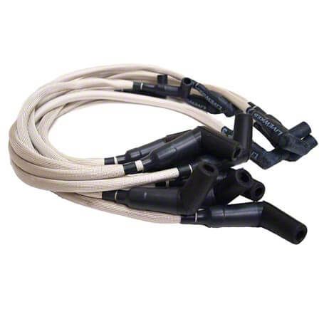 Performance Distributors LiveWires® are a high quality, low resistance set of spark plug wires designed to deliver all of the spark energy from the coil to the plugs. LiveWires are built with a high temperature sleeve that protects the plug wire from the extreme under hood temperatures. The sleeving is made from a non-flammable heat treated glass braid, much like the type that is used on today’s ovens. This unique sleeving provides heat protection up to +1400° F and offers excellent resistance to moisture and chemicals. Inside this high temperature sleeve is an 8mm spiral core wire with a durable and lasting silicone jacket. The spiral core consists of a stainless steel wire wrapped around a magnetic core. This offers an extremely low resistance value of 300 – 350 Ohms per foot for optimum spark travel. Spiral core wire is also radio suppression, so there is no electronic interference with the radio and they work great with delay boxes and stutter boxes.