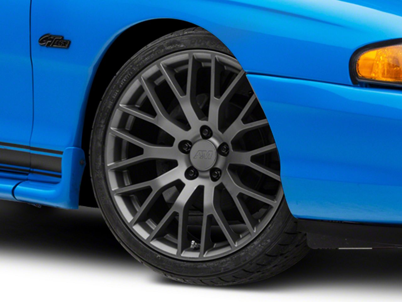 The 19x8.5 American Muscle Wheels Performance Pack Style Charcoal Wheel is completed in a dark charcoal hue that is lighter than the standard "Henry Ford" black.