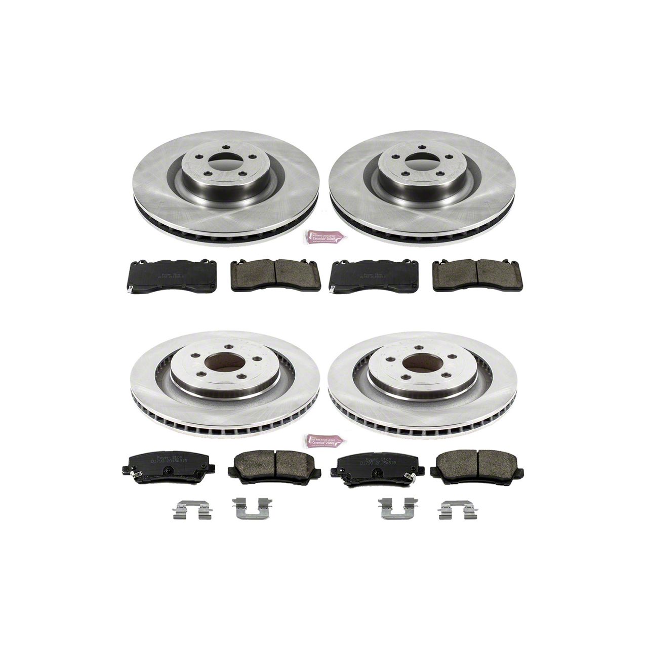 Full Front and Rear Kit. This OE Replacement Brake Rotor & Pad Kit includes everything you need to upgrade your Mustang's braking in the front, including (2) Front Rotors, (2) Pairs of Front Brake Pads, (2) Rear Rotors, (2) Pairs of Rear Brake Pads, (1) bottle of high-temperature brake lubricant and (1) stainless steel hardware kit.