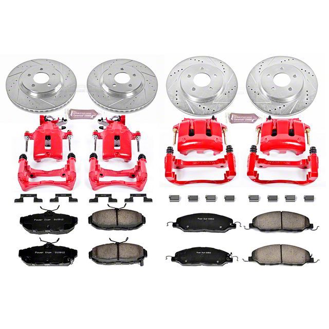 Performance Braking. Get the best out your Mustang and never miss a stop with this PowerStop Z23 Evolution Brake Rotor, Pad and Caliper Kit; Front and Rear. Manufactured for intense high-horse power machines, this kit features drilled and slotted rotors for reliable stopping ability especially in rainy conditions. It is also equipped with Z23 Evolution Sport pads, which is especially formulated with a ceramic friction material infused with carbon fiber for superior grip, low dust-output, and lasting service life.