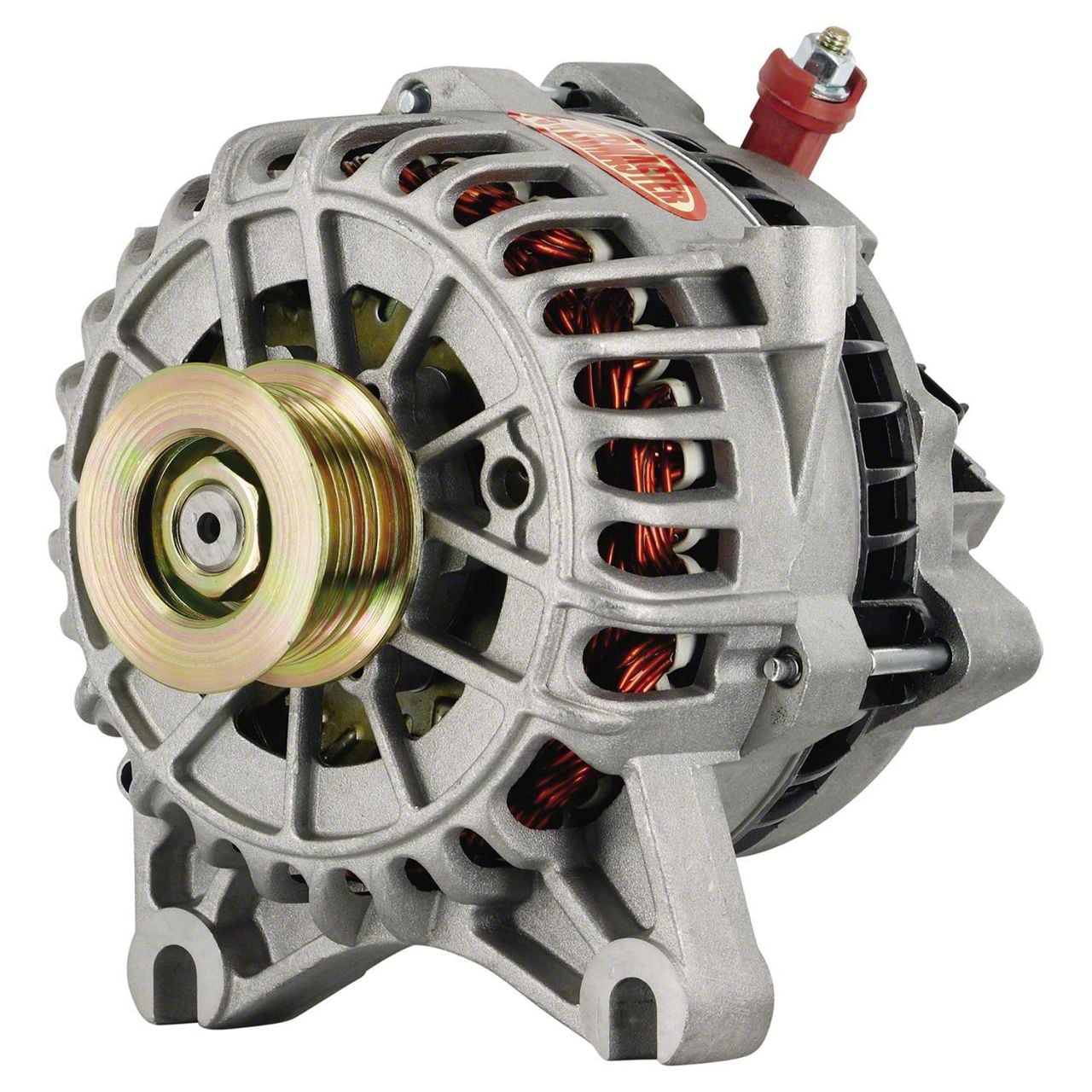 Enhanced Performance. Elevate your Mustang's electrical system with the Powermaster 6G Style Large Frame V Mount Alternator with 6-Groove Pulley; 200 Amp; Natural. Offering a robust 200 amp output, this alternator is designed to handle high-demand electrical systems, ensuring that your car maintains optimal performance without sacrificing power. Whether you're upgrading your sound system, adding performance electronics, or simply seeking a more reliable and efficient power source, this alternator delivers. Its high-efficiency operation reduces strain on your vehicle's electrical system, while the enhanced power delivery ensures that all your accessories run smoothly.