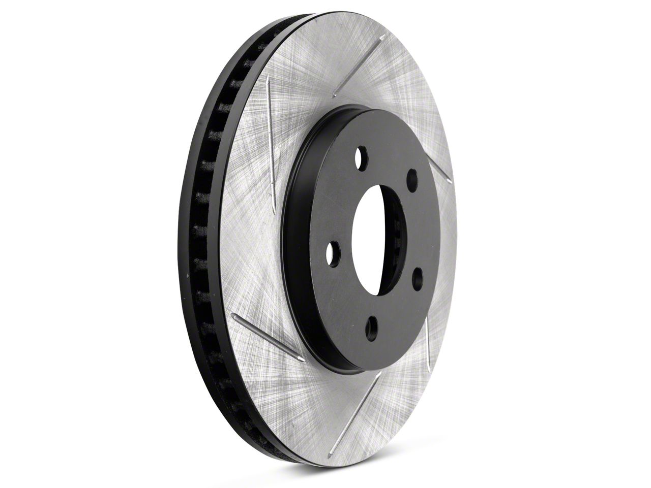 Excellent Braking Function. Providing an interesting aesthetic change to your Mustang wheels with their slotted design, StopTech Slotted Rotors create a rotational pump effect for cooling. The curved vanes inside work almost like the vanes of a fan or propeller, sucking air in through the opening in the hat and blowing it out the edges, together with whatever heat it absorbs while pouring along the internal channels. This holds temperatures down below the level at which brake fade would happen. The component also de-glazes the brake pads with its slots, making sure they keep plenty of bite. These same surface features guide water and dust off the rotor so it stays clean, relatively dry, and functions well in all conditions, even intense rain or slushy, watery roads.