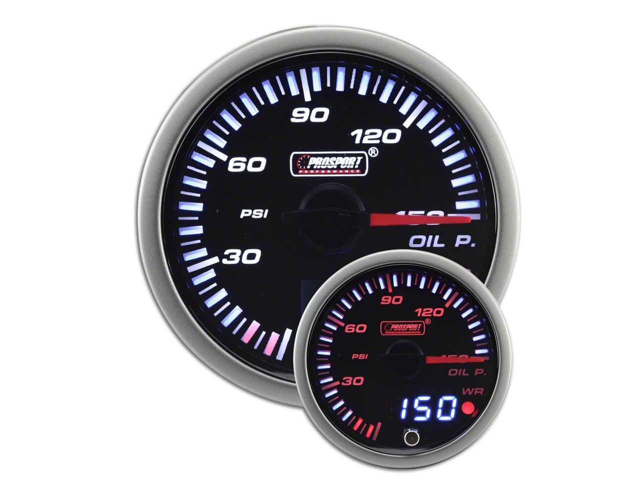 Functional Design. Oil pressure is a vital engine parameter. To enable you to monitor this parameter effortlessly and in real time, Prosport used a digital and analog display. A 52mm diameter bezel allows you to easily take readings while driving without straining. A 270° sweep which accurately measures your oil pressure from 0 to 150 PSI, ensures that every change is recorded and relayed on the dial. A compact design makes this gauge suitable for tight mounting options.