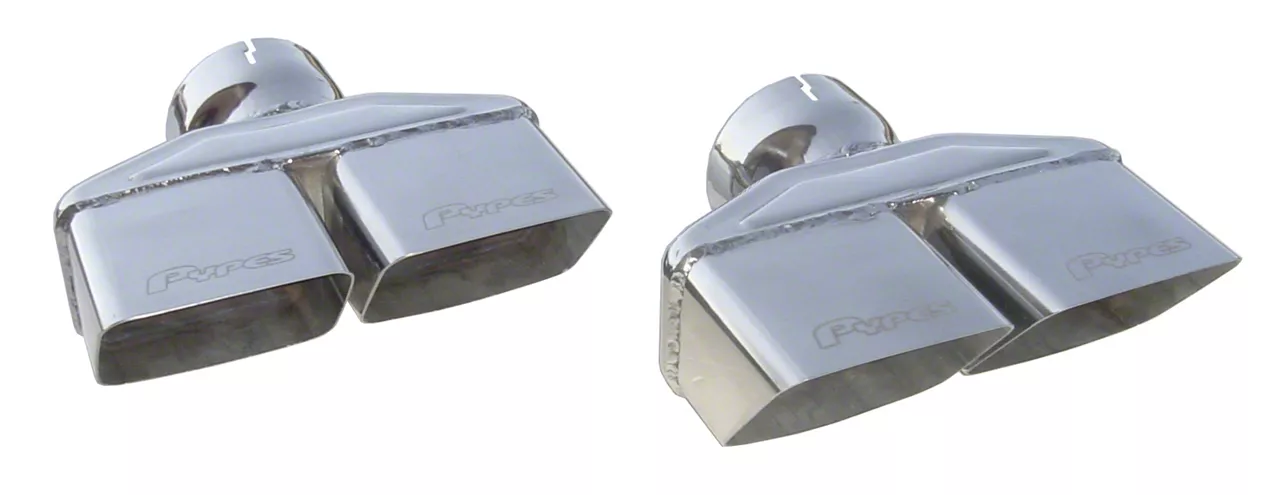 Rectangular Exhaust Tips by Pypes. Replace and modify those worn out exhaust tips with a set of top grade Polished Pypes 3 Inch Dual Rectangle Exhaust Tips. Amplify your exhaust's appearance with a polished 304 stainless steel finish, slanted cuts, and rugged Pypes engraving. Each tip measures 7.5 inches wide and 6.5 inches long.