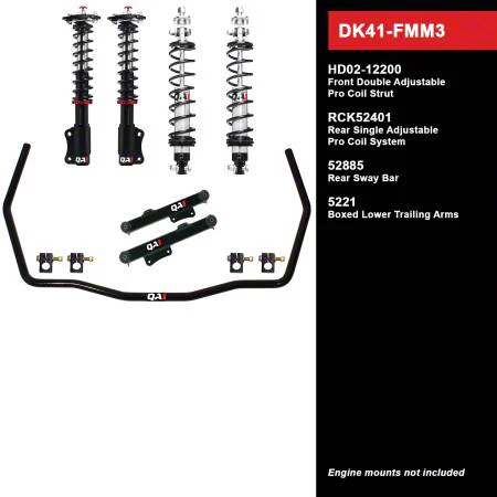 The QA1 Level 1 Drag Race Kit is an ideal choice for street/strip Fox Body Mustangs. The kit includes lightweight double adjustable front struts, single adjustable rear coil-overs, boxed trailing arms, and rear sway bars.