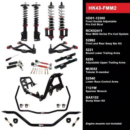 Handling and Suspension. The QA1 Level 3 Handling Kit with Coil-Overs (Wide Stance) is the ultimate solution for enhanced handling and suspension performance. This meticulously crafted kit is designed to take your driving experience to new heights. Featuring a set of high-performance coil-overs, this kit ensures superior control and stability on the road. The Front Double Adjustable Coil-Overs and Rear Mod Series Coil-Overs offers unmatched level of tunability and control.