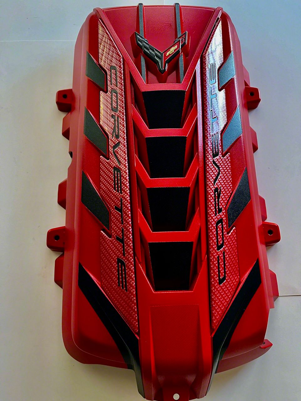 Engine Cover; Torch Red/Black with Black Letter Red Carbon Fiber Rails (20-26 6.2L Corvette C8 Coupe)Find parts that fit my vehicle