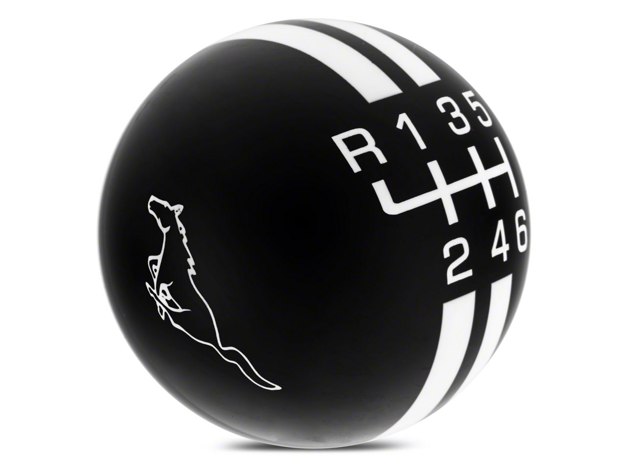 Quality Construction. Made from a high quality partek black resin compound for its strength and durability, this 2-1/8" diameter Rally Stripe Shift Knob features a white 6-speed shift pattern engraved on the top along with white rally stripes and a white Running Pony Logo on either side. The engravings have been inlaid and polished smooth, giving you years of use without fear of fading.