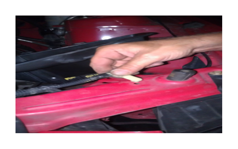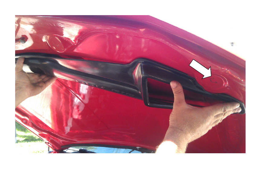 Note: In Figure below, the white arrow shows the location of the hood stopper location.