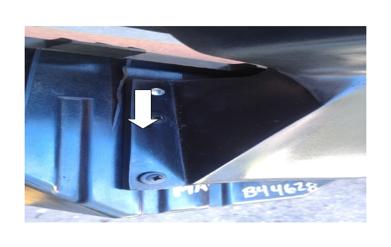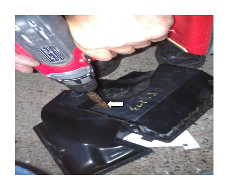 5. Using ½” drill bit, enlarge existing drain hole in bottom of factory air box to accommodate the excess water from the hood scoops when it rains. Note: the white arrow in the pictures below show the enlarged hole for water.