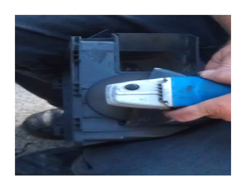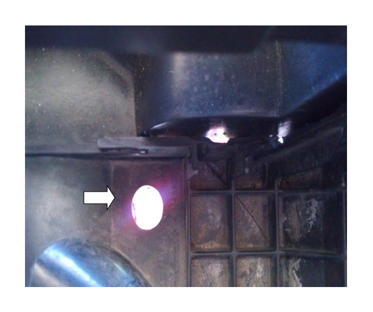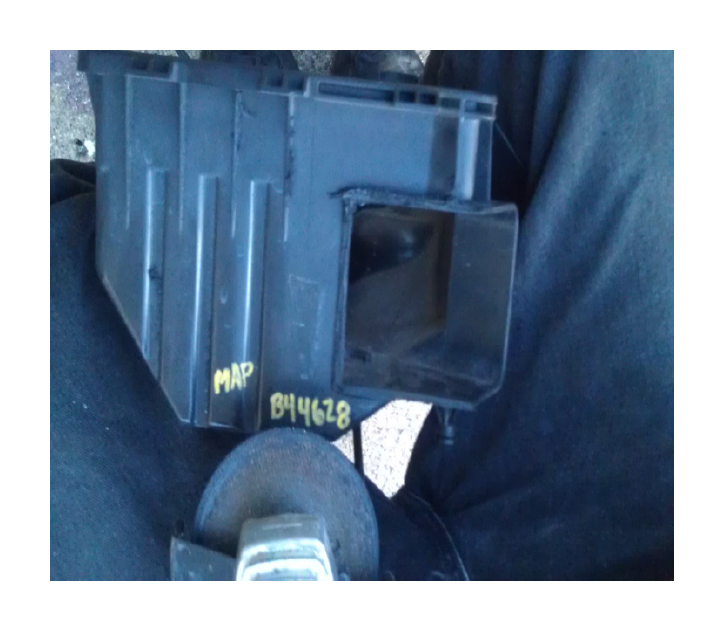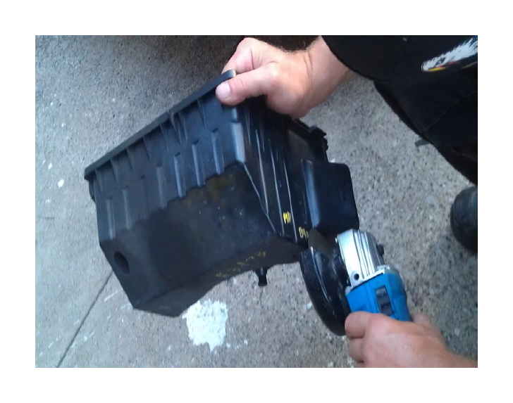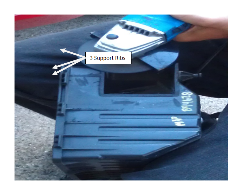1. Using a grinder with cutting wheel, lay wheel flat on front of air box and cut into the air inlet hole as shown below. Note: In the picture below the white arrow shows wheel flat with box. White box shows piece cut out.