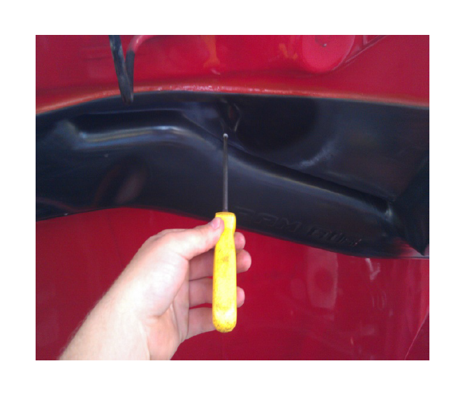 5. Using ONLY a Phillips screw driver install self tapping screws into holes in diversion plate and securing plate to hood. DO NOT USE DRILL. IT WILL STRIP THE HOLES IN THE FIBERGLASS. There should be 22 holes in the diversion plate to apply screws. Note: Pictures below shows installing screws into plate/hood with ONLY screw driver.