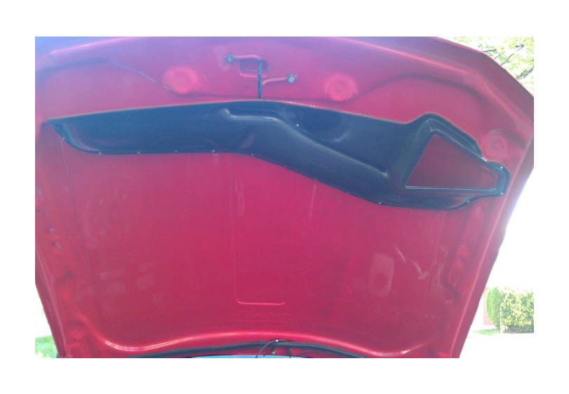 2. Remove red backing from 3M Tape and place Air diversion plate onto hood. DO NOT LET GO OR 3M WILL NOT WORK.
