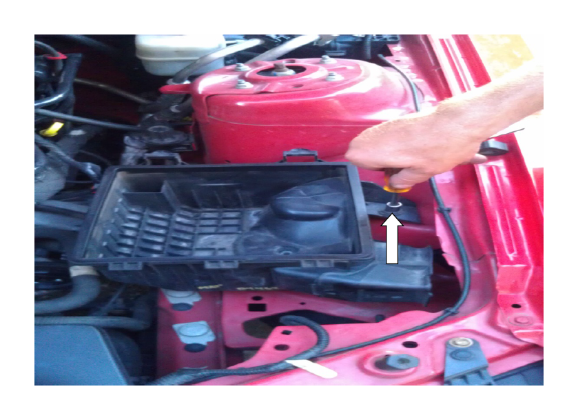 Note: In the picture below, the white arrow shows the location of the 10mm bolt to remove the air box.
