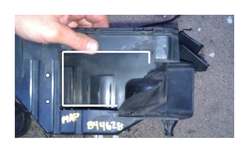 6. Using the grinder, cut the designated square out marked on template. Note: in the picture below, the white lines show the air box after the square and holes have been cut from box using template.