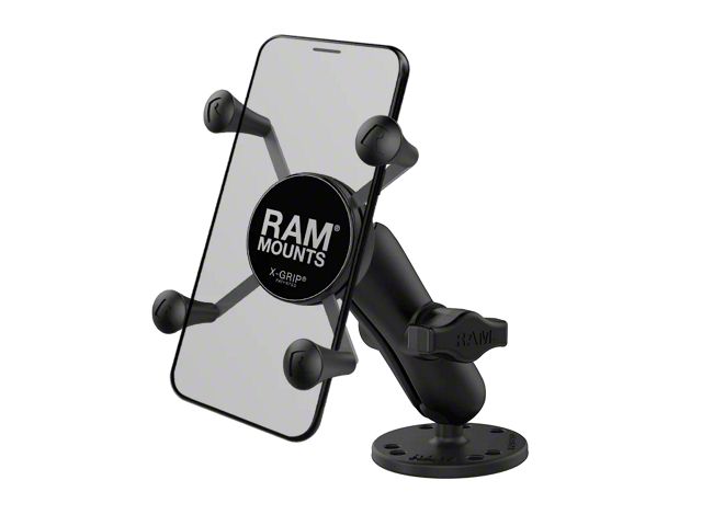 Description. The RAM-B-138-UN7U consists of a 2.5" diameter round base with the universal AMPS hole pattern, double socket arm and universal spring loaded X-Grip cradle for cell phones. Designed into the mount is a 1" diameter patented rubber ball and socket system with adjustment points at the both ends of the socket arm; this with a twist of the arm knob, allows you to move the mount to your optimum viewing position. The included X-Grip cradle has a clean and clever four leg design that sports great holding power without hiding your phone behind foam pads and plastic. The spring loaded X-Grip cradle expands and contracts, allowing for a perfect custom fit of your cell phone. The perfect complement to the modern sleek interior of today's vehicles, the RAM X-Grip is the cell phone cradle evolved. The X-Grip includes a device tether recommended for outdoor applications. The cradle is compatible with handheld devices that will fit the dimensions listed below. It is important to verify the dimensions of your handheld device with a case/sleeve/skin when determining the overall size.