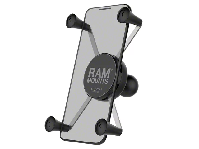 Description. The popular spring-loaded RAM X-Grip phone holder features an 'X' design that expands and contracts to provide a perfect fit for your device – even if it's in a case. Made of powder-coated, marine-grade aluminum, stainless steel components, and high-strength composite, the RAM X-Grip phone holder is compatible with a wide variety of RAM double socket arms and mounting bases. This large version of the RAM X-Grip fits phones ranging from 1.75" to 4.5" in width and keeps your device completely functional and accessible. No matter what double socket arm and mounting base you pair the RAM X-Grip with, RAM ball and socket technology allows for near-infinite adjustability to achieve the ideal viewing angle – while also extending the life of your phone by providing shock and vibration damping. For outdoor applications – like being used as a motorcycle phone mount – the RAM X-Grip includes a device tether that is recommended for added security and peace of mind.