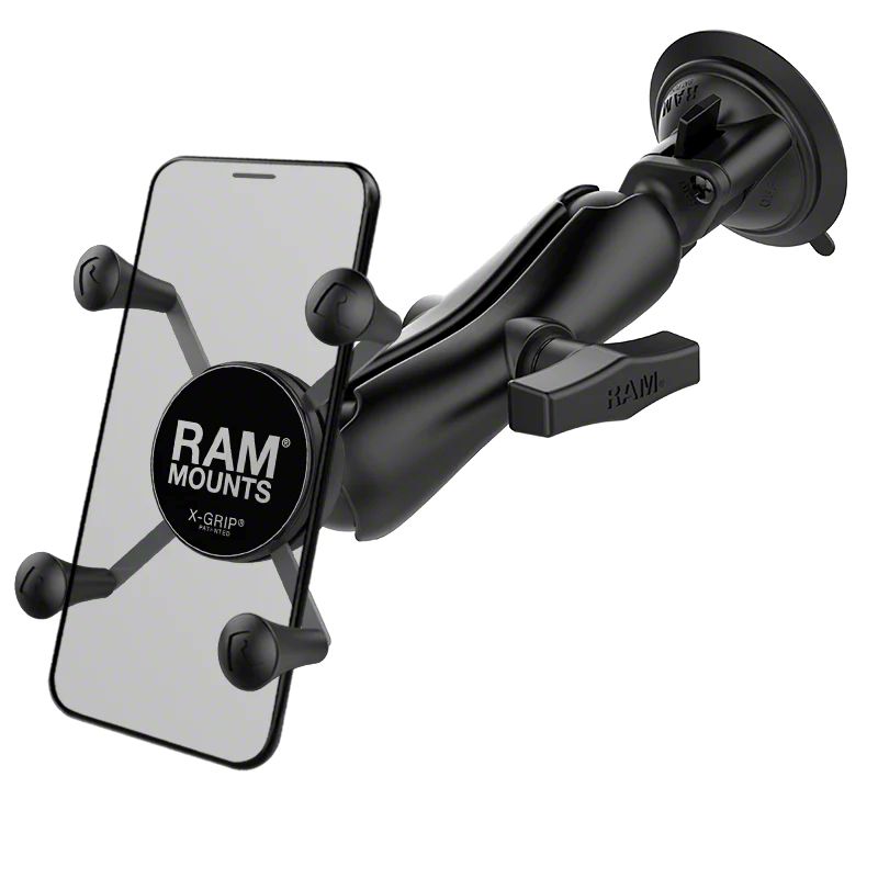 Description. The RAM-166-UN7U consists of a 3.3" diameter suction cup twist lock base, 1.5" diameter double socket arm and universal spring loaded X-Grip cradle for cell phones. The suction cup, twist lock base is designed to have a strong hold on glass and non-porous plastic surfaces, including RAM adhesive disks. The mount is designed with a RAM 1.5" diameter patented rubber ball and socket system that has adjustment points at both ends of the double socket arm; this allowing for almost infinite adjustment and perfect viewing angles. The included X-Grip cradle has a clean and clever four leg design that sports great holding power without hiding your phone behind foam pads and plastic. The spring loaded X-Grip cradle expands and contracts, allowing for a perfect custom fit of your cell phone. The perfect complement to the modern sleek interior of today's vehicles, the RAM X-Grip is the cell phone cradle evolved.