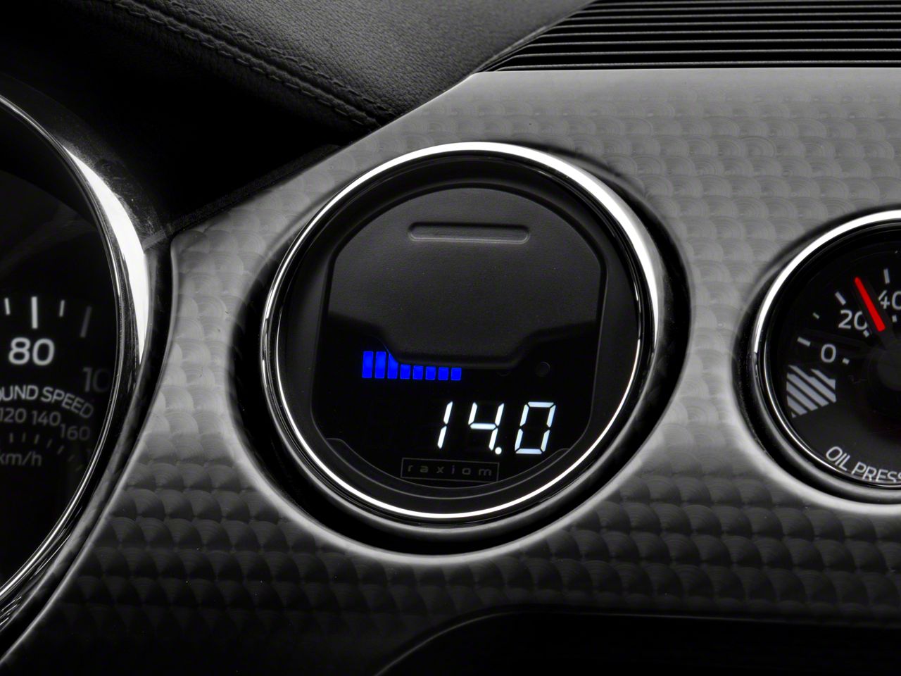 Multi-Function Digital Vent Gauge. Make sure your S550 Mustang is running at its best by monitoring all of its critical engine parameters with a Raxiom Vent Integrated OBD2 Multi-Gauge. Raxiom's Multi-Gauge gives you the ability to view multiple engine systems in one sleek digital gauge. This Raxiom Multi-Gauge comes pre-installed in a genuine ford vent housing. The housing then installs directly into your dashes HVAC vent opening for a super clean integrated appearance. The Multi-Gauge will not obstruct airflow allowing your Mustangs heating and air conditioning to operate normally.
