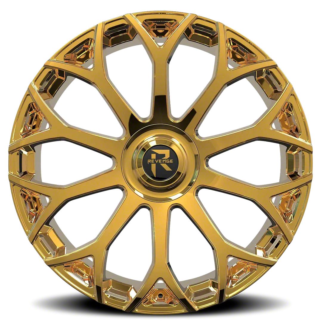This 22x9 Revenge Luxury Wheels RL-105 Gold Wheel; 22x9; 20mm Offset is completed in a high-quality gold finish to make your wheel the envy of everyone. For added looks and durability, the wheels has a durable clear coat that withstand the rigors of daily driving.