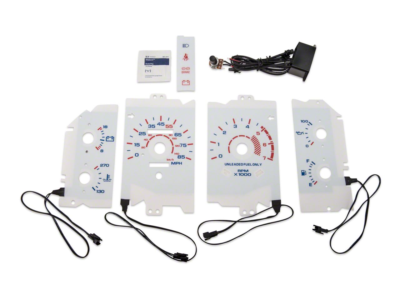 SVT Cobra Styling. Upgrade your Foxbody Pony's boring stock gauge cluster with a White Face Reverse Glow Gauge Insert Kit for modern SVT Cobra inspired styling.