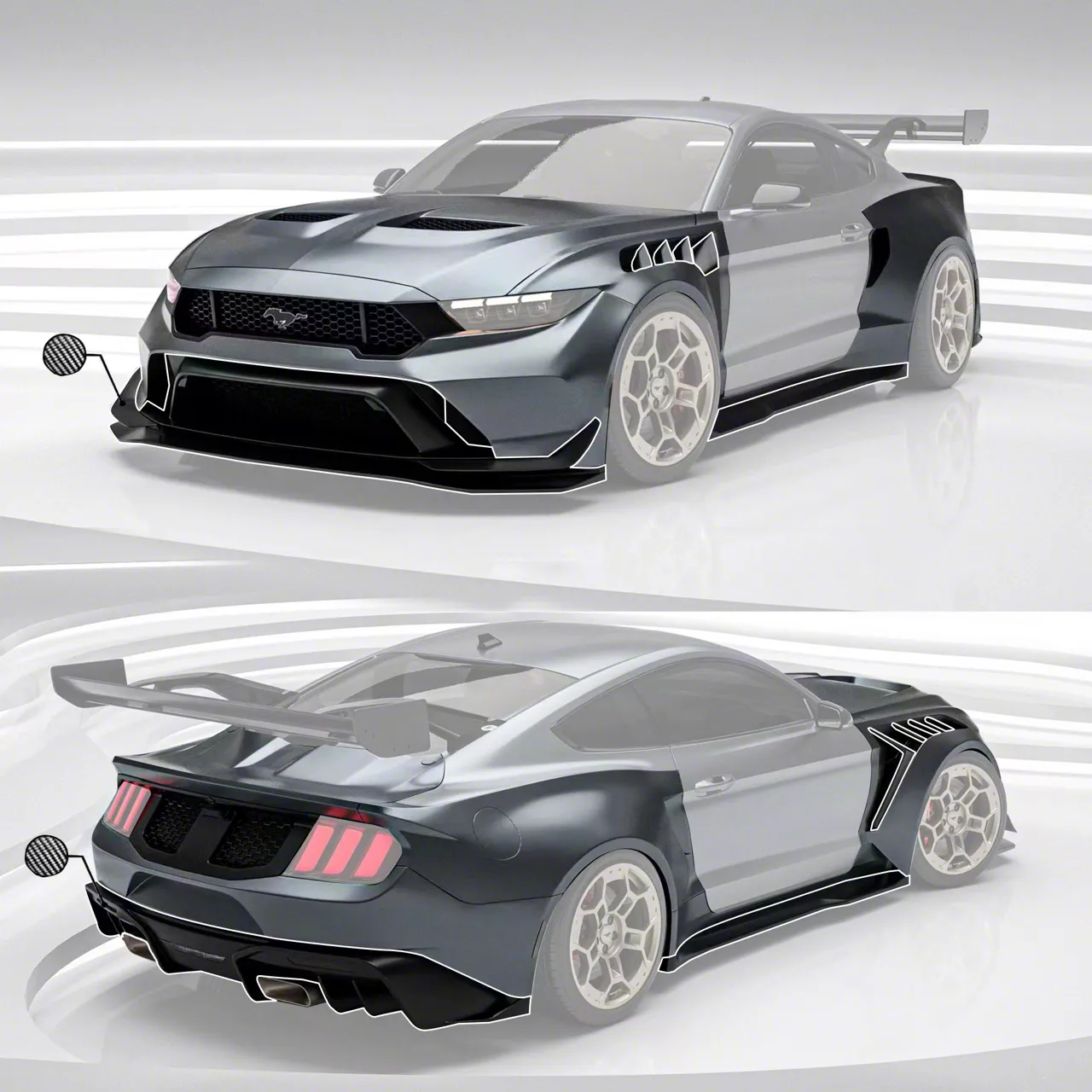 The Body Kit is suitable for the following vehicles: FORD Mustang (S550.1 & S550.2) For S550.2 (2018-2020) models, new S650 Style headlights & brackets will be supplied. An adapter is also supplied, however custom wiring may be required Wheel Spec + Fitting Notes: Running 20" wheels that are flush to the arch, you will need to trim the corner of the side skirt (inner section) to allow for full rotation of the front tyre without rubbing. Rear arches will need to be cut to allow for suspension travel for the wider wheels/tyres. Red car spec: (2-Piece Wheel) F: 20" 10J ET-55 (285/30/20) R 20" 11.5J RT-29 (315/30/20) Blue car spec: (1-Piece Wheel) 19" 10J ET-32 (20mm Spacer Front & Rear)* 19 / 20" GTD Style 1-Piece Wheels can be supplied for £1350 Video contains base S650, please note this only fits the S550 Base FRP Kit Contains: FRP Front Bumper & Lip FRP Bonnet FRP Widebody Replacement Front Arch FRP Widebody Side Skirt FRP Widebody Rear Arch FRP Rear Bumper & Diffuser + Stainless Exhaust Tips FRP Replacement Rear Boot Stainless Steel Valveless Exhaust FREE SHIPPING Carbon Kit Contains: FRP Front Bumper & Carbon Lip / Surround FRP Bonnet FRP Widebody Replacement Front Arch + Exposed Carbon Vent FRP Side Skirt + Carbon Lower Side Skirt FRP Rear Arch FRP Rear Bumper & Carbon Diffuser + Stainless Exhaust Tips FRP Replacement Rear Boot Stainless Steel Valveless Exhaust FREE SHIPPING Configurable below + GTR Wing (FRP or Carbon) UPGRADE Carbon Bonnet UPGRADE Carbon Boot UPGRADE Valved Stainless Steel Exhaust This product is not affiliated with, endorsed by, or approved by Ford Motor Company. All trademarks remain the property of their respective owners. FRP Front Bumper & Lip FRP Bonnet FRP Widebody Replacement Front Arch FRP Widebody Side Skirt FRP Widebody Rear Arch FRP Rear Bumper & Diffuser + Stainless Exhaust Tips FRP Replacement Rear Boot Stainless Steel Valveless Exhaust. FREE SHIPPING