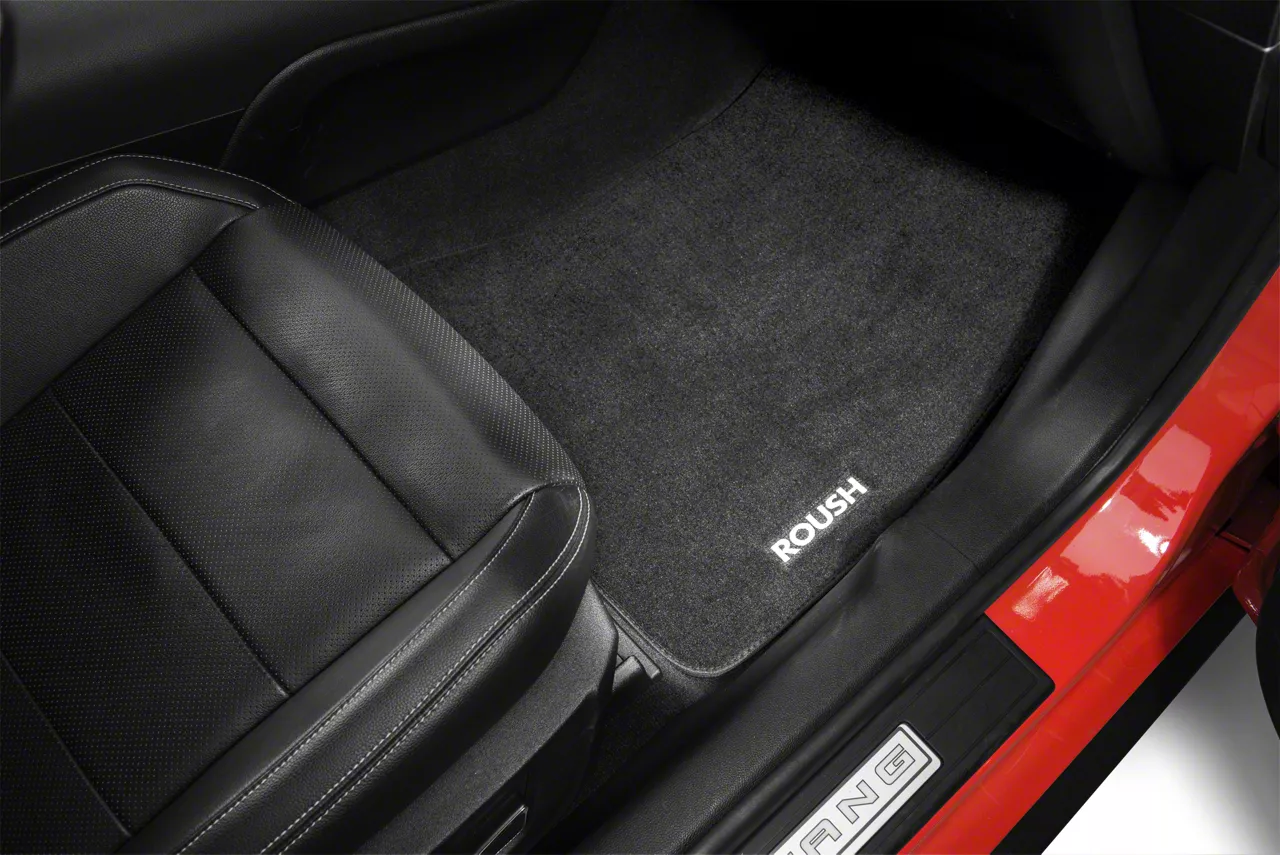 Embroidered Floor Mats. With the ROUSH Embroidered Front and Rear Floor Mats, you get 4 mats perfectly designed to fit your Ford Mustang. Designed to both protect your interior and show your love of ROUSH products, the mats are black with the ROUSH logo embroidered in gray.