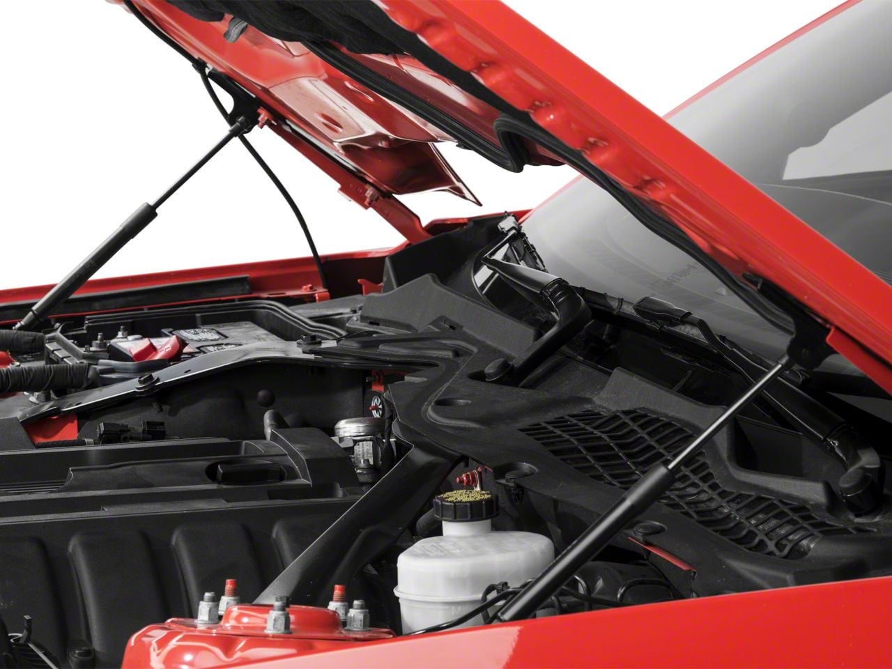 Enjoy the View. The extension-dampening design allows the struts to hold up your hood to the maximum angle without bowing or putting stress on the hood hinges. You can get in there to make repairs without worrying about the hood. Plus, the Roush Hood Strut Kit comes with support pads that protect the hood and it reroutes the windshield washer line to avoid pinching.