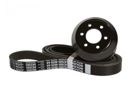 Optimized Performance. The Roush Phase 2 TVS Supercharger Serpentine Belt significantly enhances the supercharged system's efficiency on Mustang GT models. Crafted with modulus glass fiber non-stretch cords and featuring a self-insulating abrasion-resistant fabric, this belt is designed to be quieter than chain drives and more durable. The matte black finish not only adds a sleek look but also contributes to the belt's overall durability. As a direct replacement, it integrates seamlessly, providing an immediate improvement in performance by ensuring optimal power transfer and a reduction in slippage.