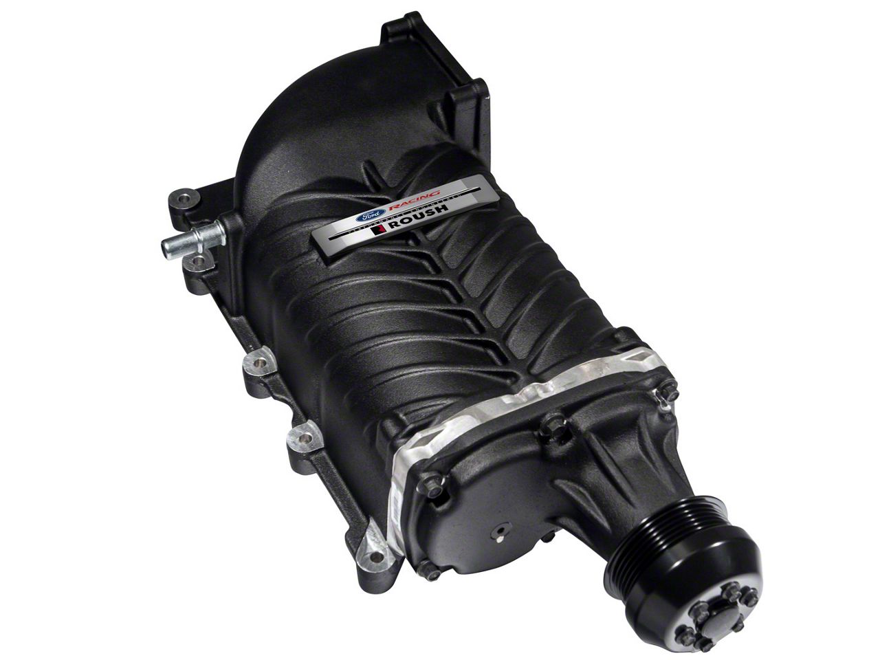 Monstrous blower kit, Roush style. This complete package transforms your GT into a track-shredding beast. Kit comes complete with a 2.3L TVS® supercharger with black finish, upper and lower intake manifolds, an air-to-water intercooler, a low temp radiator, an oversized coolant degas bottle, a ROUSH® cold air intake system, a twin 60mm throttle body with matching spacer, a 85mm supercharger pulley and unique ROUSH designed fuel injectors.