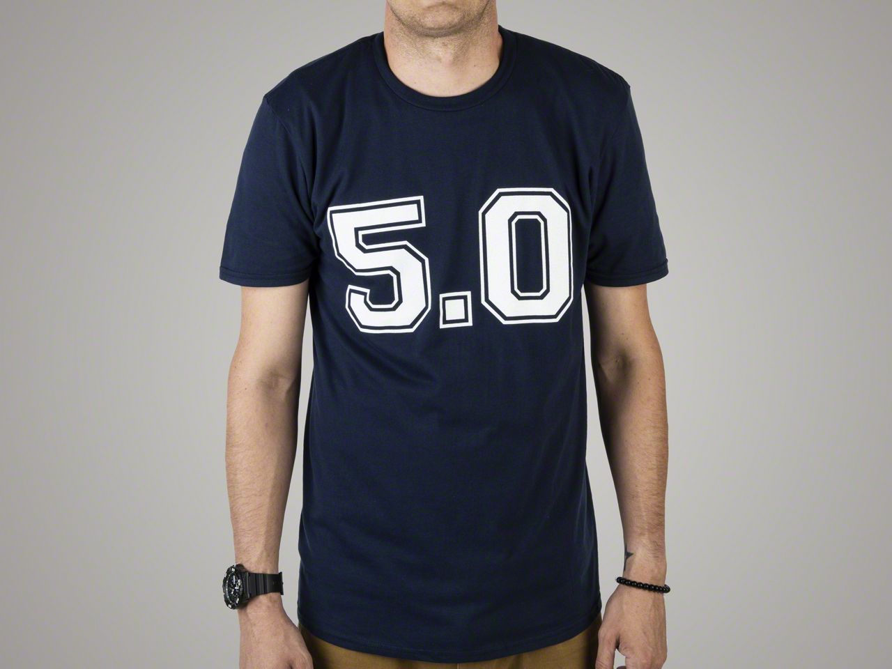 Coyote 5.0. This great looking navy blue Short Sleeved T-Shirt is a must have for all coyote powered Mustang owners. Featuring the 5.0 moniker in a football jersey font, this Graphic Tee makes the perfect gift for yourself or the fellow Mustang lover in your life.