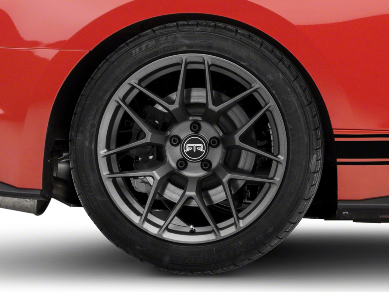 The 19x10.5 RTR Tech 7 Satin Charcoal Wheel; Rear Only; 19x10.5 is completed in a dark charcoal hue that is lighter than the standard "Henry Ford" black, this wheel features a durable matte clear-coated finish for a stealthy appearance.