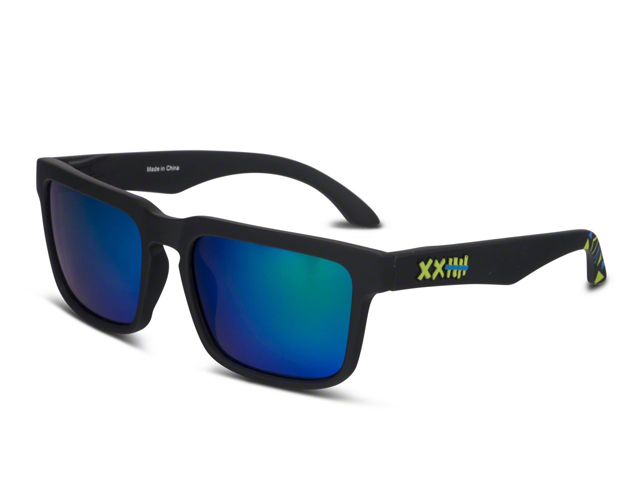 Vaughn Gittin Jr. Signature Sunglasses with Black/Green Triangles. These stylish Signature Sunglasses designed by none other than Vaughn Gittin Jr. are sure to impress. Featuring the "XX5" Logo on the outer arms, blue and yellow triangles at the end of the arm and Vaughn's signature on one inner arm, these black shades have green lenses. Grab a pair of these polarized UV400 shades, the perfect set for shows, track events or just hanging out with other Mustang enthusiasts.
