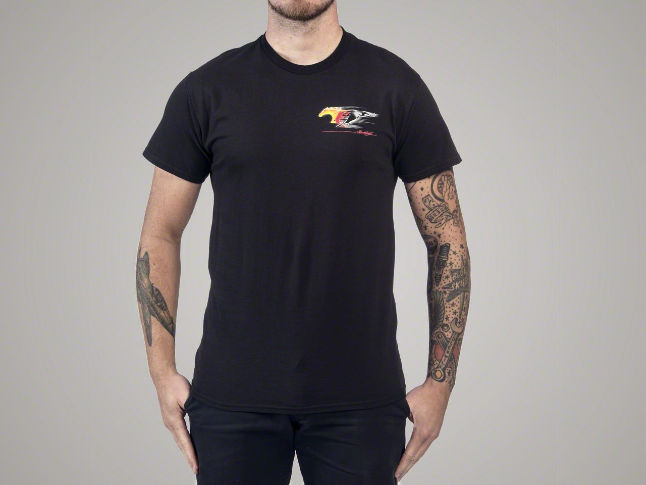Flaming Pony. This great looking black t-shirt features a large Flaming Running Pony Emblem on the back with a smaller version on the front left chest. Officially Licensed by Ford, this men's T-shirt is the ideal piece of active wear for shows, track events, or just hanging out with other Mustang enthusiasts.