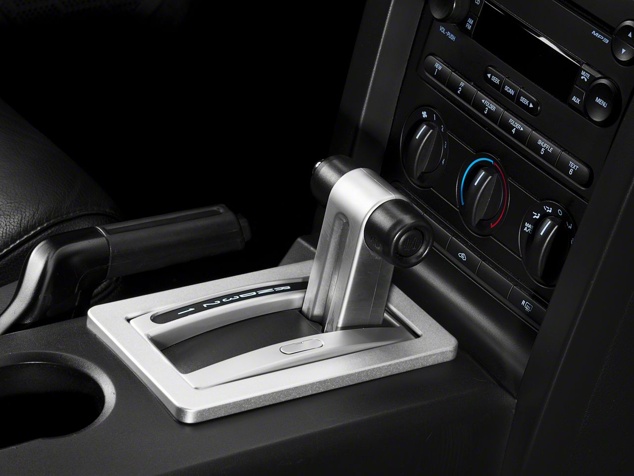 Modern Styling. Add the modern look of satin to your automatic Mustangs stark boring plastic interior with a Satin Shifter Bezel that matches the existing satin accents to complete the unfinished appearance of your stock interior.