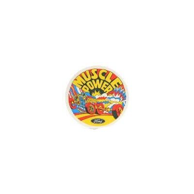 Cool Vintage Design. Inspired by the popular flower power theme of the 70s, this decal features a full-colored illustration of a high-speed vehicle in multi-colored background. Printed on the decal is the text Muscle Power and Ford's logo underneath.