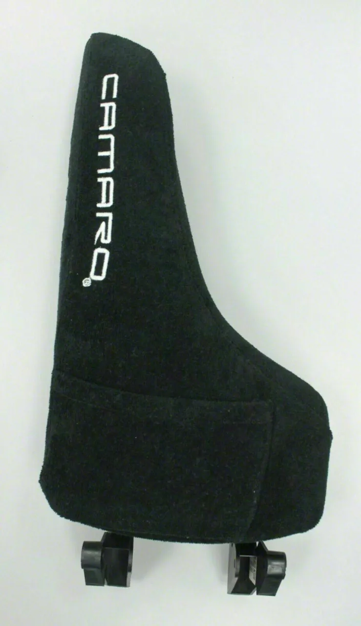 Construction and Appearance. This Center Console Cover was fabricated from cotton terry/velour, a combination so soft you'll feel like you are resting your arm on pillow while cruising. The cover is black, which goes with anything, and "CAMARO" is written across in silver to really enhance the style. There's a convenient pouch that stores small valuables like a phone, or glasses, or a map if people actually still use such things.