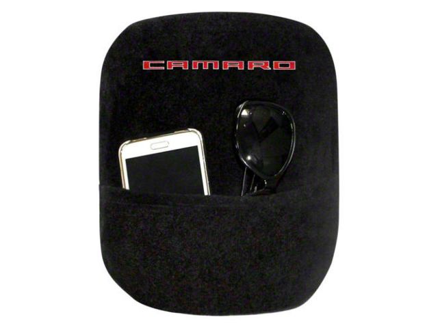 Construction and Appearance. This Center Console Cover is manufactured from 100% cotton terry/velour, which is soft and that's important if you rest your arm or elbow on the center console when you drive. The cover is black, which complements any colored interior, with "CAMARO" written across in silver. There's a pouch that can hold small things like a phone, or glasses, or a map.