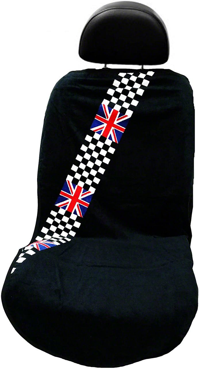 Application. This Seat Towel with a Checkered Flag Design in Black is designed to fit most vehicles.