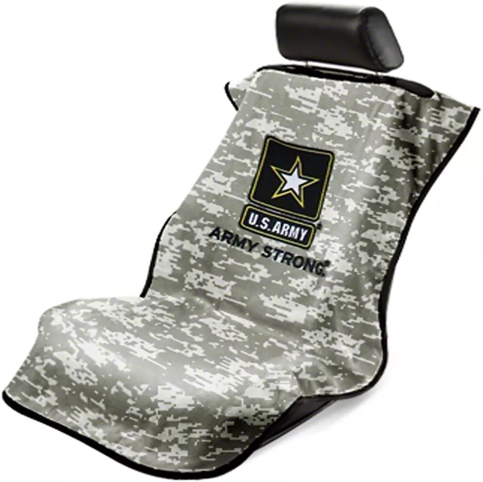 Application. This Seat Towel with US Army Logo in Camo design will fit most vehicle models with minimal adjustment.